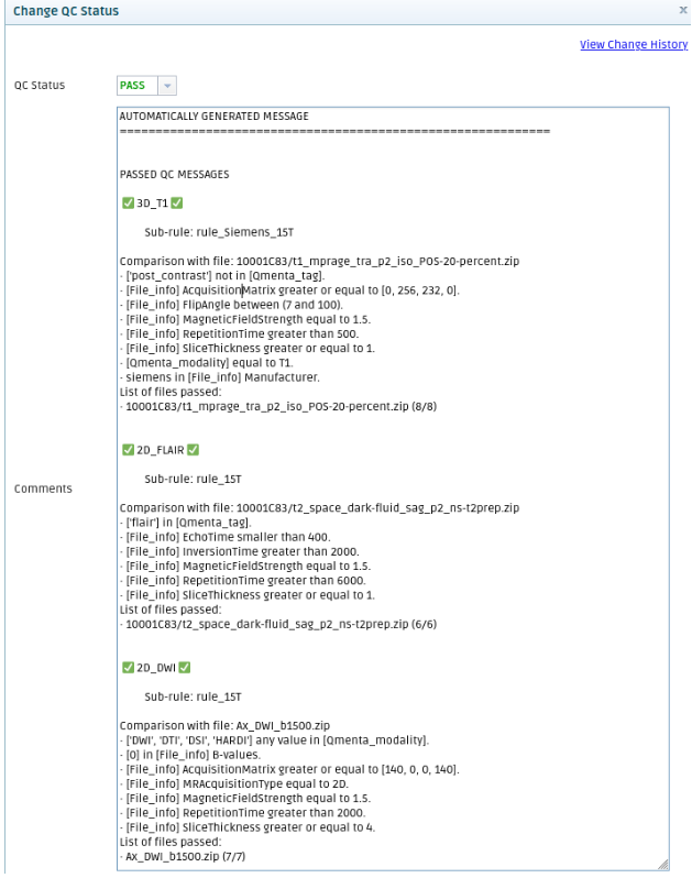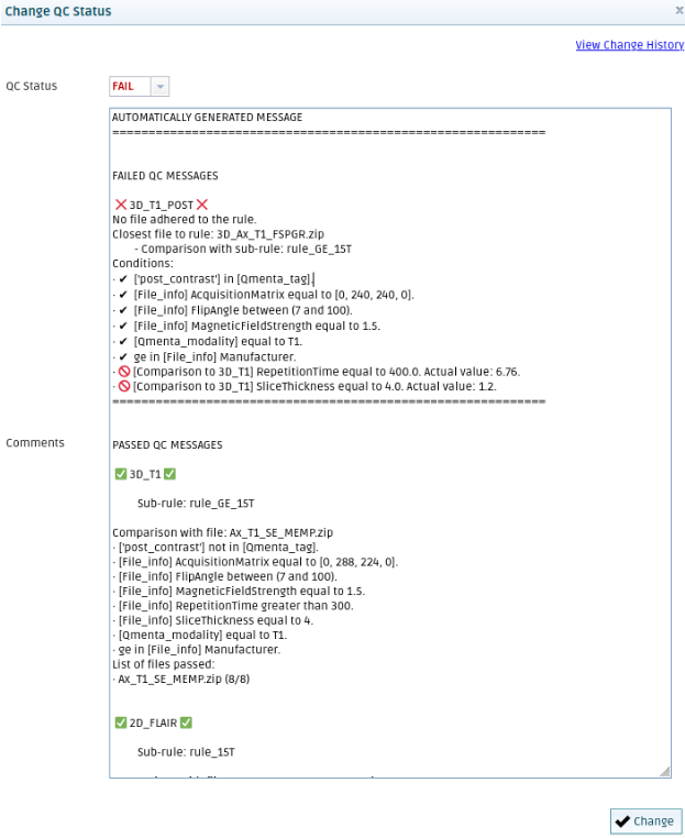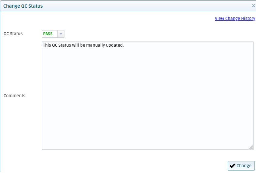 Select a QC Status from the dropdown list, and add the QC Comments if desired. To enact the change, click “Change”. You may consult prior changes by clicking “View Change History”.