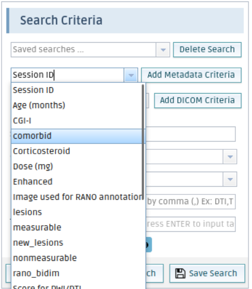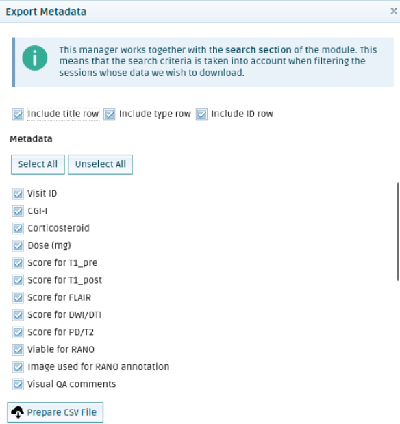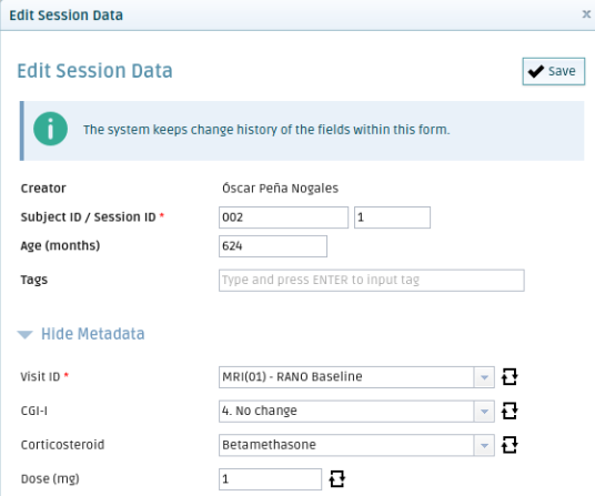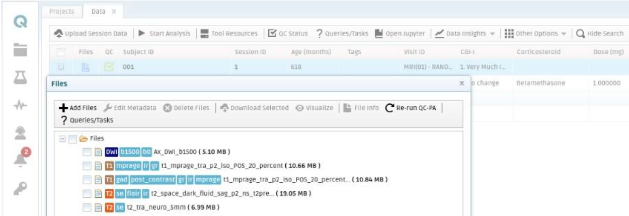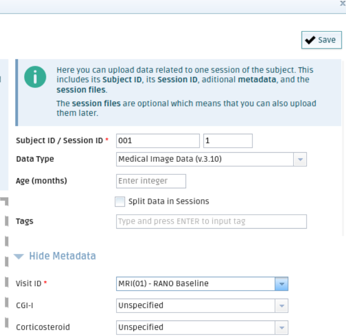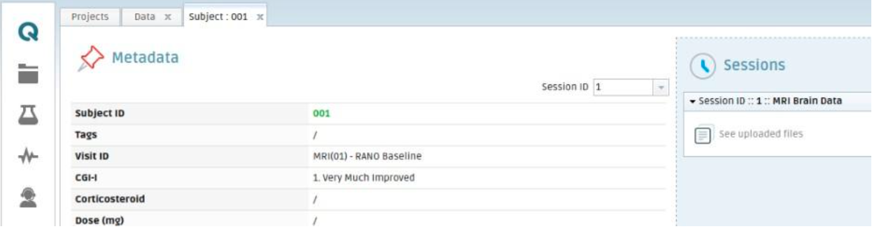 Metadata: Numerical and qualitative data associated with a Subject ID/Session ID in a project in QMENTA Platform(e.g., visit date, clinical scores, corticosteroid, etc…).