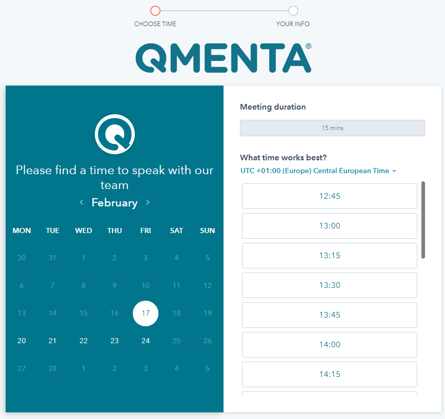 In the case you are not part of an existing study, after clicking “No” on Fig. 6 you will be asked to book an activation call. Please select a date and time (Fig. 8) and the QMENTA team will onboard you to the QMENTA Platform.