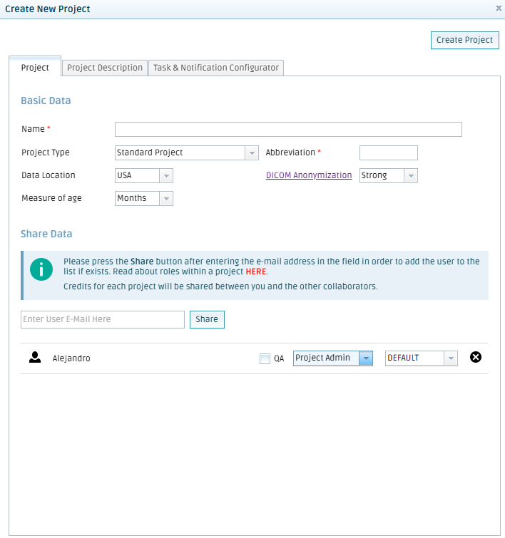 Project: The imaging data and the corresponding analyses are organized by Project in the QMENTA Platform. Each Project is a separate entity and information is not shared across Projects.