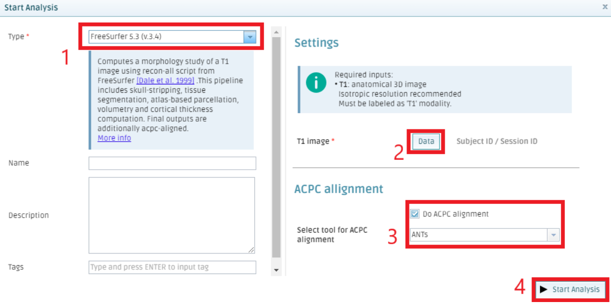Analysis: A single analysis or workflow of sequential analyses which can be executed in the QMENTA Platform (e.g., FreeSurfer, Protocol Adherence Automation, etc.).