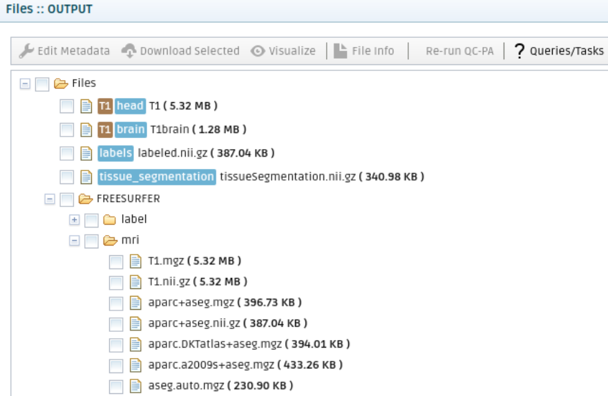 In other cases, a pop-up window appears listing the output result files generated. You are able to “Download Selected” files to your local computer or to “Visualize” them within the QMENTA Viewer.